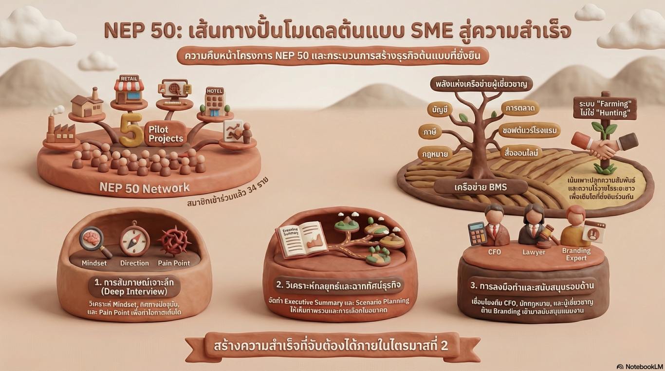โครงการ NEP 50 เป็นโครงการภายใต้ BMSที่มีเป้าหมายเพื่อยกระดับและสนับสนุนผู้ประกอบการ SME อย่างเข้มข้น โดยเน้นการสร้างผลลัพธ์ที่จับต้องได้จริงในช่วงเวลาที่กำหนด