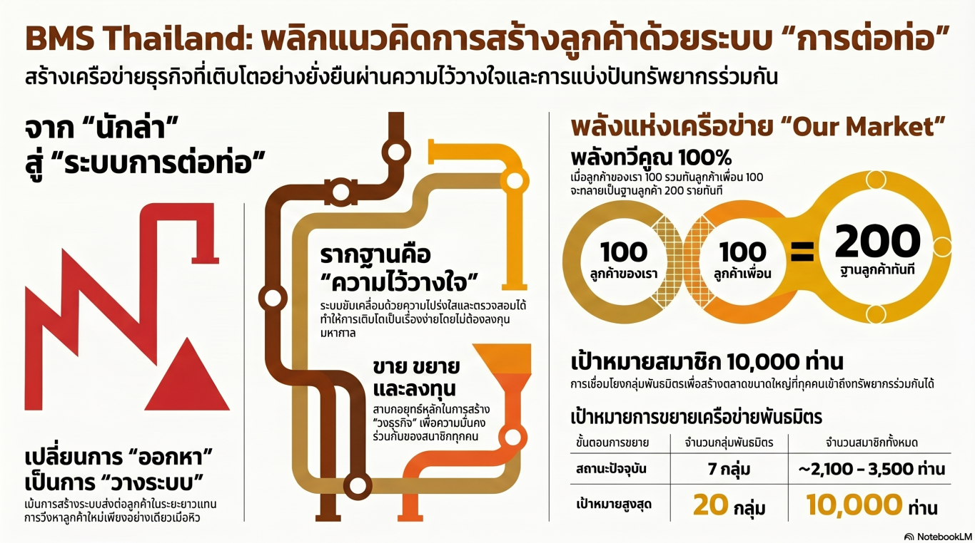แนวคิดของ BMS Thailand ที่มุ่งเน้นการสร้างระบบเครือข่ายธุรกิจแบบ ยั่งยืนและมั่นคง มากกว่าการมุ่งเน้นเพียงการขายของแบบครั้งคราว หัวใจสำคัญคือการสร้าง ระบบการต่อท่อ วางราง ที่เปลี่ยนฐานลูกค้าของเพื่อนให้กลายเป็นโอกาสทางธุรกิจร่วมกันเพื่อสร้างการเติบโตแบบทวีคูณ กลยุทธ์นี้อาศัยพื้นฐานของ ความไว้วางใจและความโปร่งใส ในการเชื่อมโยงพันธมิตรทางธุรกิจเข้าด้วยกันเป็นกลุ่มก้อนขนาดใหญ่ โดยมีเป้าหมายหลักในการสร้าง ตลาดร่วมขนาดใหญ่ ที่ครอบคลุมสมาชิกนับหมื่นคนเพื่อรองรับการขยายตัวและการลงทุนในอนาคต โมเดลธุรกิจนี้จึงสะท้อนถึงพลังของการแบ่งปันทรัพยากรเพื่อให้ผู้ประกอบการทุกคน เติบโตไปพร้อมกัน อย่างมีประสิทธิภาพ