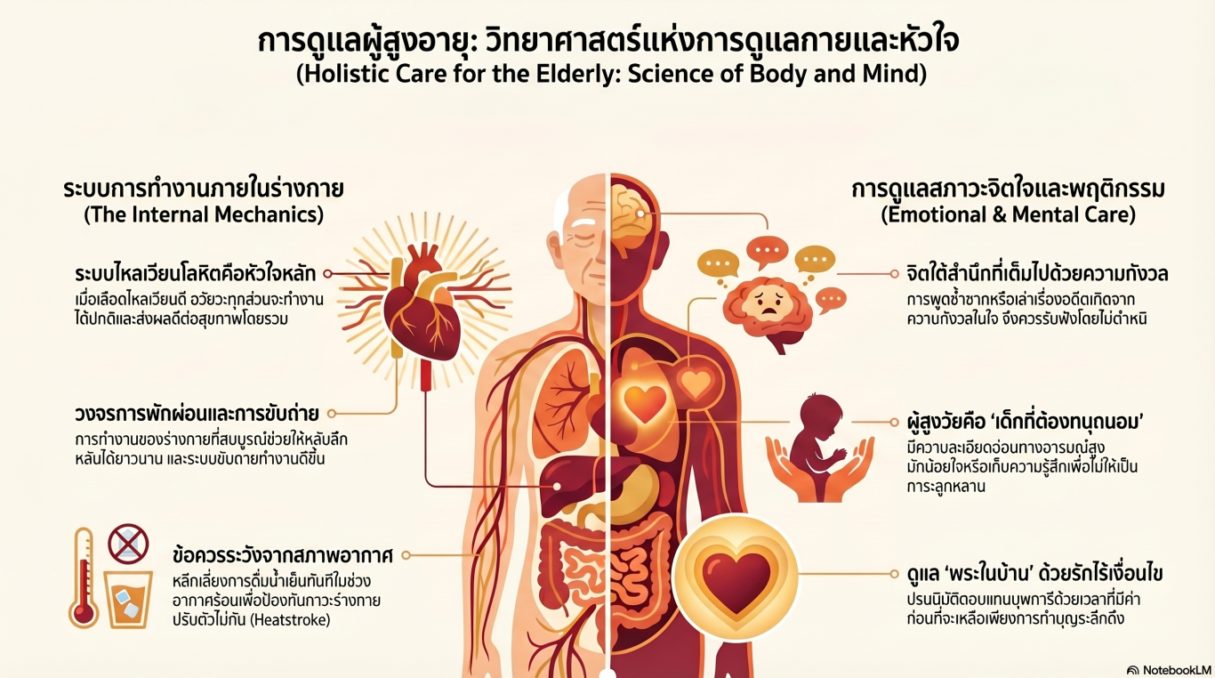 การให้ความสำคัญกับ คุณภาพชีวิตของผู้สูงอายุ ทั้งในด้านจิตใจและร่างกาย โดยในส่วนแรกเน้นย้ำให้บุตรหลานตระหนักถึง ความกตัญญูและการดูแลเอาใจใส่ อย่างใกล้ชิดในช่วงเวลาที่มีค่า เนื่องจากผู้สูงวัยมักมีความเปราะบางทางอารมณ์และต้องการความเข้าใจเป็นพิเศษ ขณะที่ส่วนที่สองได้แนะนำเกี่ยวกับ นวัตกรรมเพื่อสุขภาพ ที่ช่วยปรับปรุงระบบไหลเวียนโลหิต ซึ่งส่งผลดีต่อการนอนหลับและการขับถ่ายให้ดียิ่งขึ้น นอกจากนี้ยังมีการให้คำแนะนำในการ ดูแลตนเองจากสภาพอากาศ ที่เปลี่ยนแปลงเพื่อป้องกันอาการเจ็บป่วยกะทันหัน สรุปได้ว่าเนื้อหาทั้งหมดเป็นการส่งเสริมให้สังคมเห็นคุณค่าและ ถนอมสวัสดิภาพของผู้สูงวัย อย่างครบวงจรเพื่อให้ท่านได้ใช้ชีวิตอย่างมีความสุขและแข็งแรง